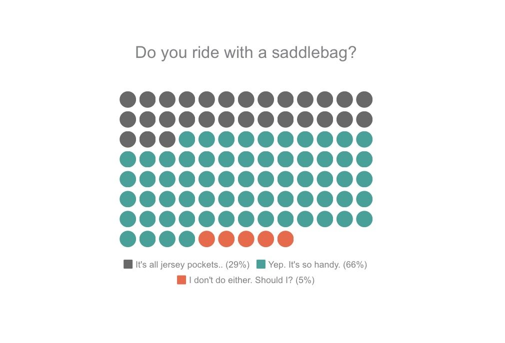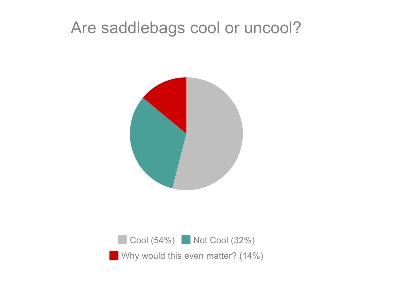 So that’s what we found before. This time, we’re actually going to address two different questions. Because this is something of a popularity contest, we first studied whether or not people found saddlebags cool or uncool. Next, we looked to see what percentage of cyclists claim to use them. Finally, we put the results into handy and aesthetically pleasing charts. No one hates a pretty chart.