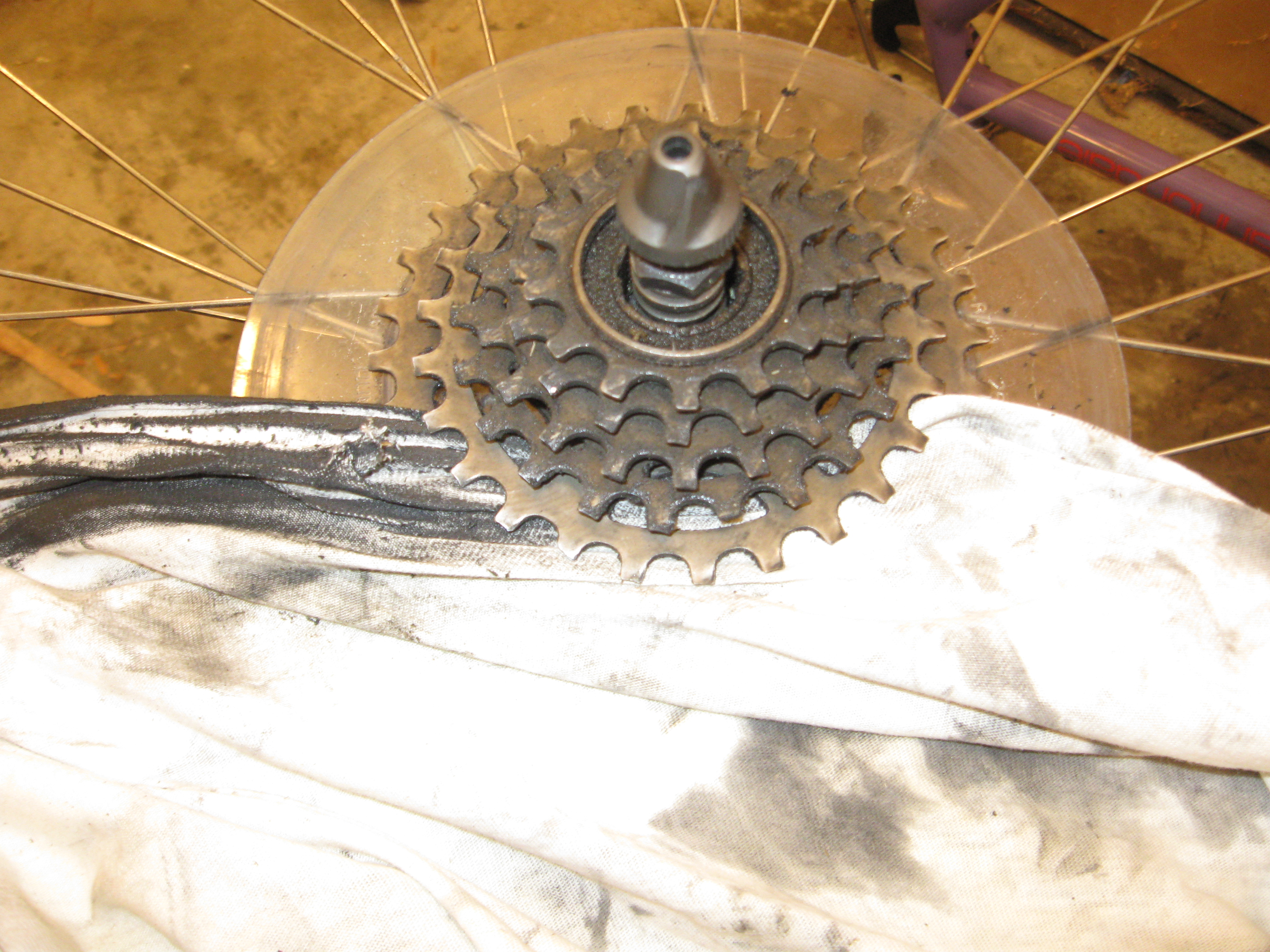 Clean the cassette. Set the wheel on your lap with the cassette facing up. Take a rag (I use old t-shirts for rags) and slide it between the cogs on the cassette and forward and backwards. The freewheel means the cassette will spin in one direction cleaning the entire cog. Remove the rag and move to the next cog.- Clean the chain rings. This is a pain. I find no matter how hard I try I cannot get into all the nooks and crannies. A brush helps, but still leaves behind residual grease. The important thing is to remove the majority of the mess. Some may use a spray degreaser, but in my opinion, spraying pressurized degreaser anywhere near bottom bracket bearings, hubs or derailleur pulleys is a bad idea.
