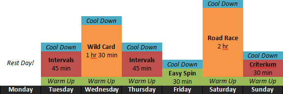 Below, I’ve laid out my weekly routine, but you’ll notice that I haven’t included Saturdays and Sundays here. Much of my plan relied on racing Saturday and Sunday during our six-week racing season. Before those races started, I used Saturday and Sunday for long endurance rides. But my weekday schedule was about the same.