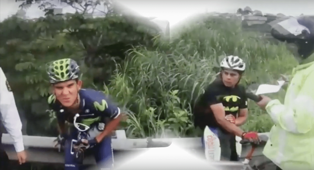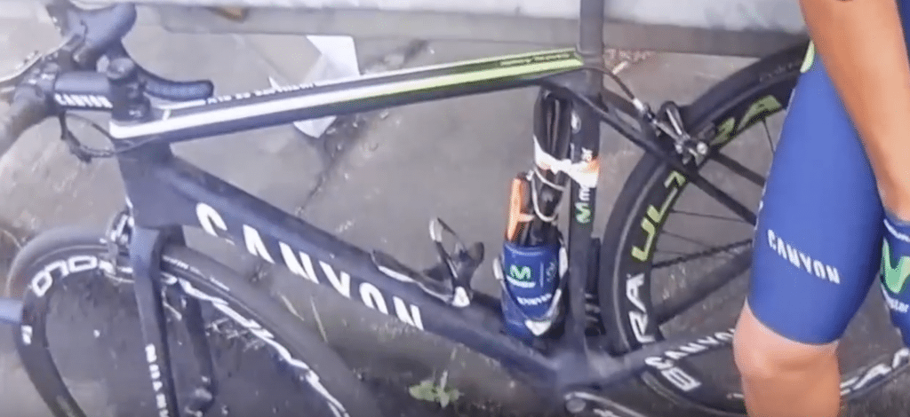 In the meantime, we’re keying in on what Amador has affixed to his bike while training. Foregoing the saddlebag (as most pros do), he’s got the cut off bottle with flat-fixing gear, pump, etc., plus an extra tire taped to the seat tube. All of this is so well placed and rubber banded that it doesn’t fall out when the officer quickly flips the bike over.