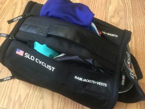 Upsides: This bag is sturdy, compact, and holds tons of extra cycling kit. Here’s a list of what I stuffed into it at once: Jersey, Bib Shorts, Baselayer, Rain Jacket, Wind Vest, Arm Warmers, Knee Warmers, Ear Warmers, Full and Half Gloves, Socks, Shoes, Shoe Covers, Cleats, Sunglasses, Cycling Cap, Heart Rate Monitor, RoadID, Head & Tail Light, Chamois Cream, & Sunscreen.