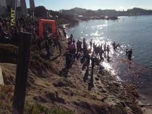 Kayakers and SUP folks start first, in a makeshift starting line in the bay. This means you won’t have to drag your kayak out into the water and get your rudders set and whatnot–you’ll be ready to start paddling the moment they blow the air horn. Both the SUPs and kayakers start at the same time, but have separate destinations. In fact, I completed the kayak option the first year I participated in the event, and it was a welcome change from the scrum of the swim start. I led out the pack for a while, but hadn’t practiced enough of the full 3-mile distance, and ended up returning to the beach in fourth place. If you’re game for this option, make sure you work on your paddling. It’s a loooong way from one end of the bay to the other, and if you’ve been neglecting arm and core workouts, you’ll feel spent quickly. The SUP option, on the other hand, is quite a short out and back.