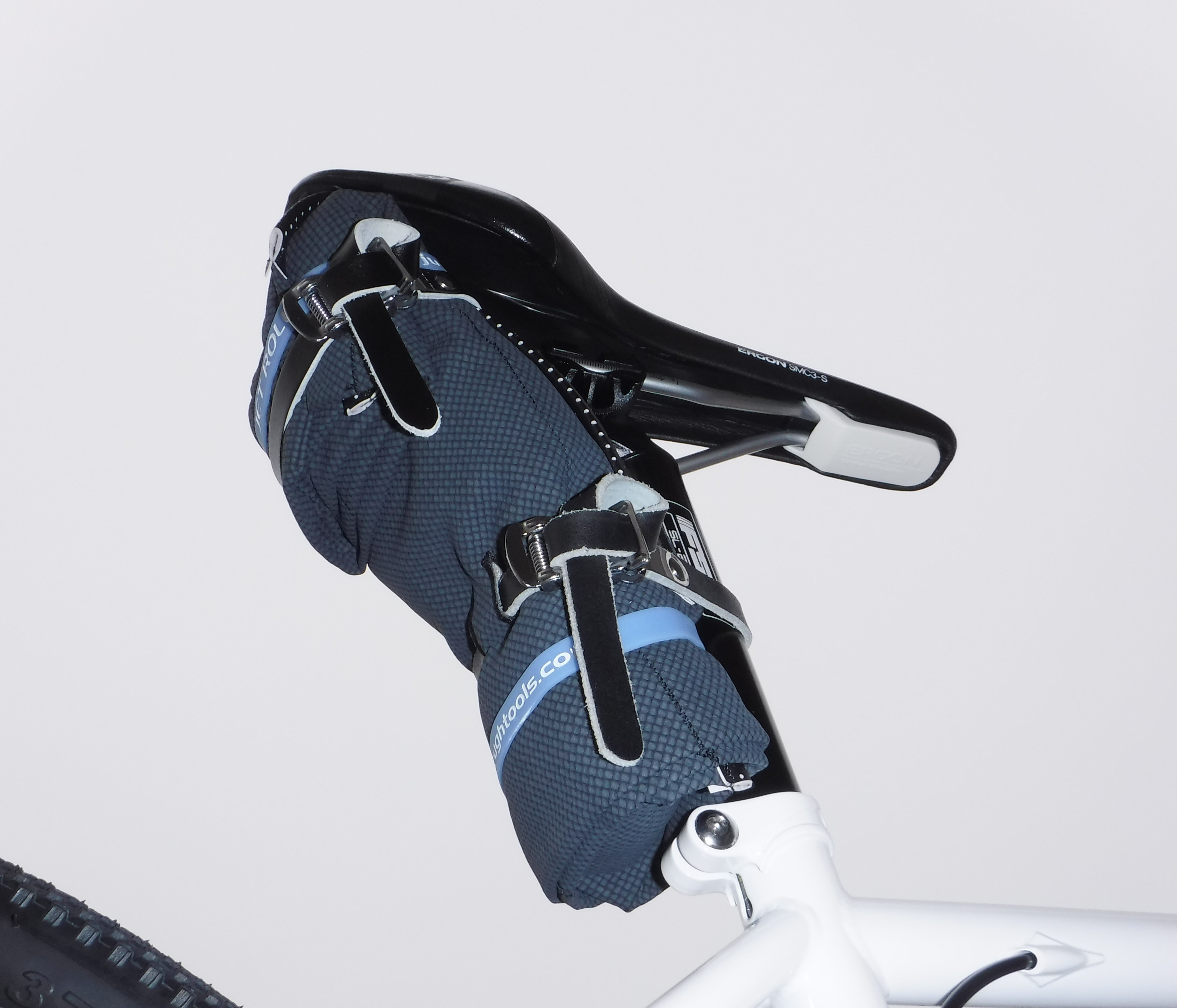 This Starfighter definitely screams class on the bike, and it fits all the usual flat-fixing gear quite easily. Plus you can choose between a white or black rail strap (nice move, Jet Roll folks, nice move). Definitely made to last.