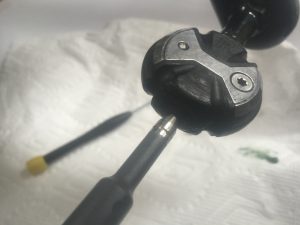 irst, take your screwdriver and remove the screw on the outer plate of the pedal. Don’t pull off the cap or anything–just the super small screw (and don’t lose it in a carpet that happens to be the exact same color. I had to use a magnet).