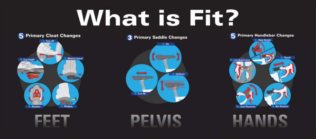 Once you’ve completed the sizing process, fitting a bicycle comes down to the contact or connection points between the cyclist and their bicycle and adjusting those moving parts on the chosen bicycle. These five connection points (9 on a time trial or triathlon bike) are the right and left foot, the pelvis, and right and left hands. Even if your bike is not the correct “size,” as long as you get the connection points in the ideal place, you can still achieve a good and comfortable bike fit. That being said (as we mentioned previously), we do recommend starting some of the ideas above in the sizing section before fitting.